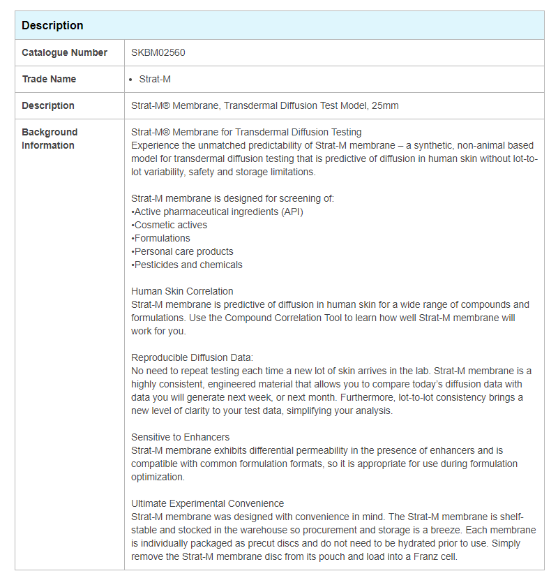 Strat-M人工皮膚膜具有低可變性,批次間穩(wěn)定性良好,不需要的特殊儲(chǔ)存或者水合要求,簡(jiǎn)單易得,能夠在一定程度上作為動(dòng)物皮膚的替代品,被廣泛的應(yīng)用在制藥、化妝品等行業(yè),受到了廣大透皮實(shí)驗(yàn)工作者的青睞。